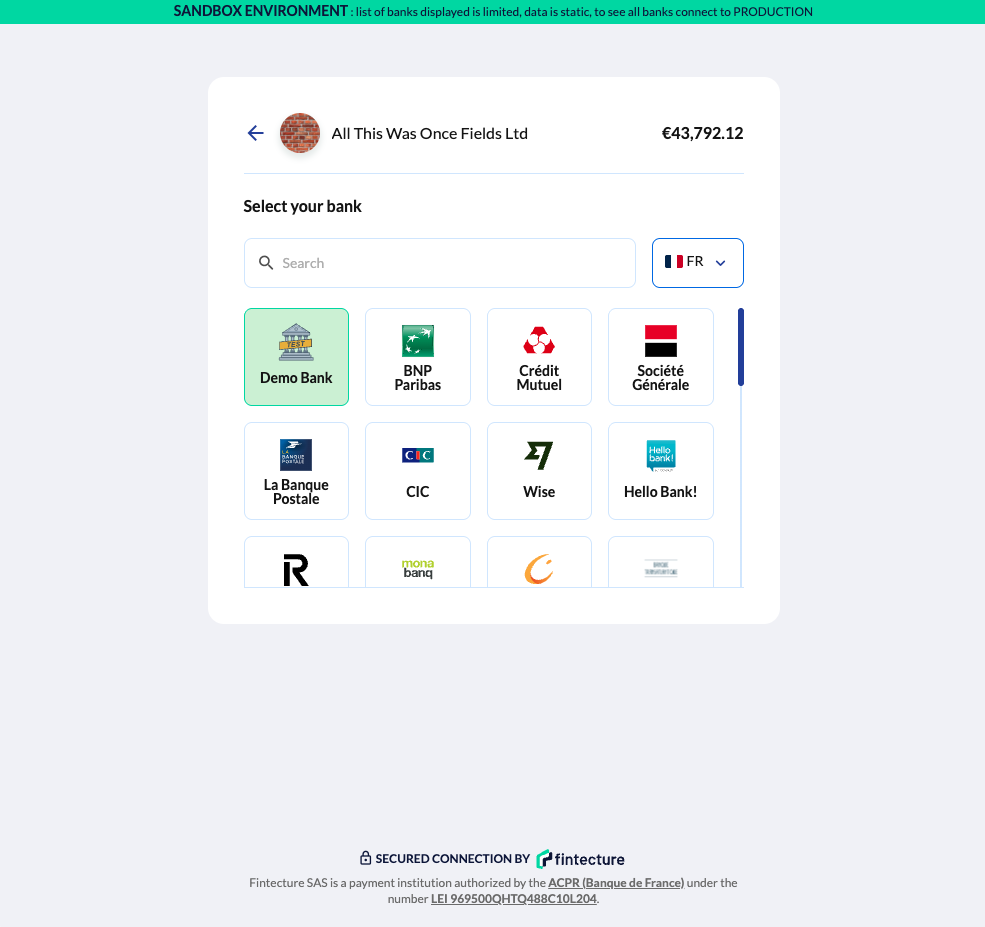 The Demo Bank is Fintecture's mock banking provider for sandbox testing. It simulates the bank experience in Connect, letting you control the payment outcome directly.