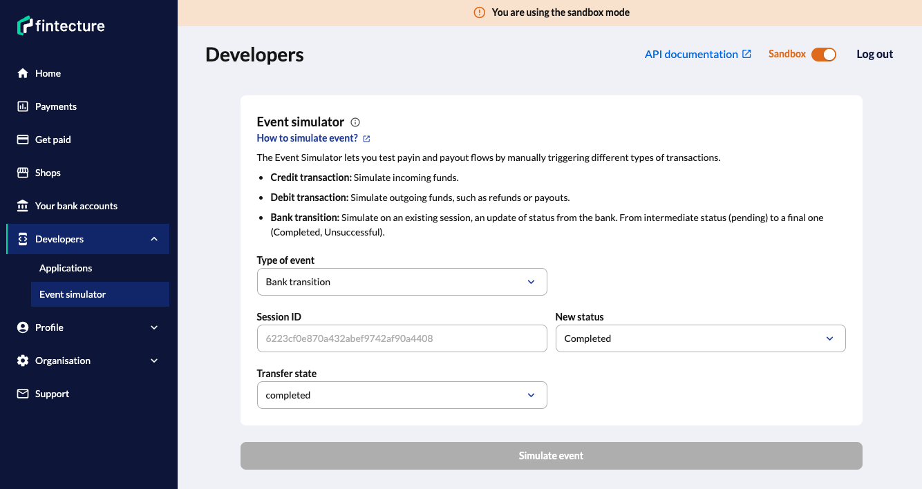 The Event Simulator lets you simulate events that happen in production — incoming transactions, outgoing payments, and bank status updates — so you can test your full integration in sandbox.